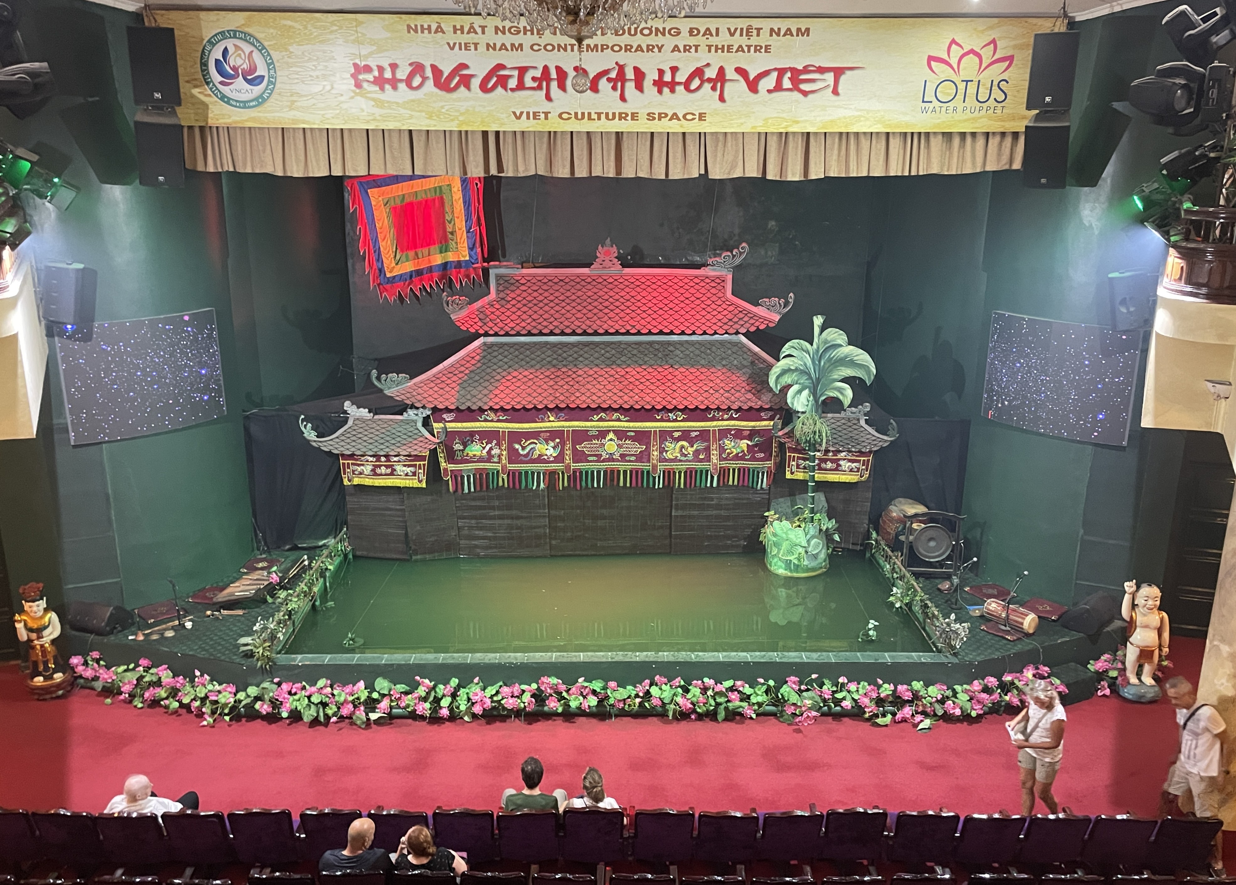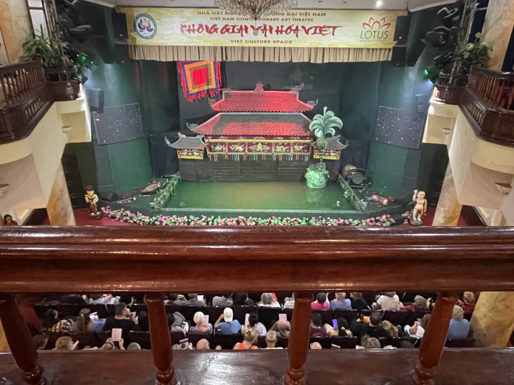 劇場内でしばし開演を待ちます。ベトナムの水上人形劇ですが、元々は田んぼが水没する洪水の季節に、村人たちのための娯楽として行われていたそうです。