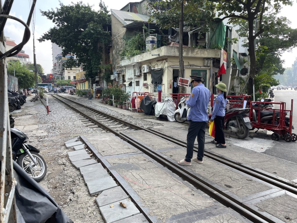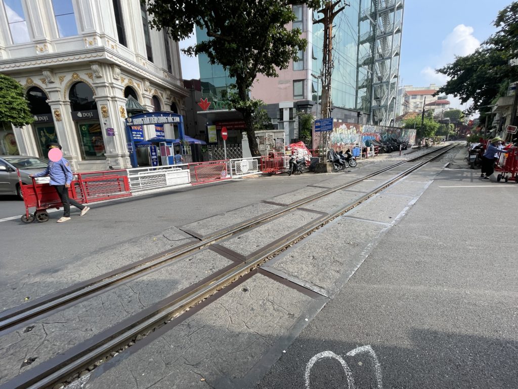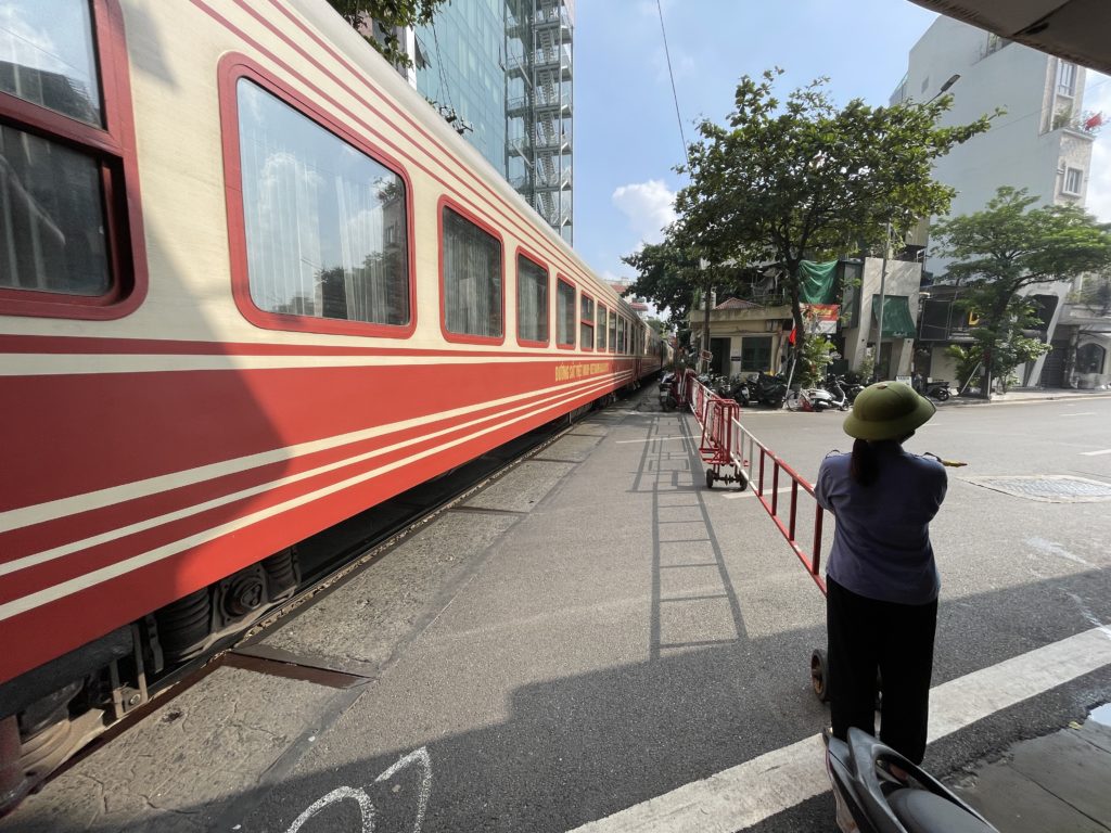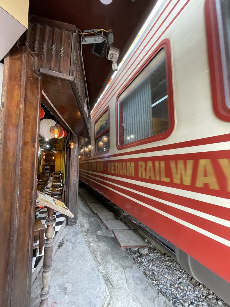 踏切を通過した列車は、線路ギリギリに建てられたお店の軒先を走っていきます。