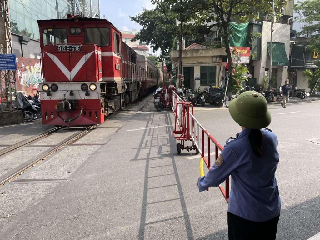 途中踏切に近づくと警報音が鳴っていて、鉄道関係者らしい人たちが動き回っています。聞いてみると「もうまもなく列車がやってくる」とのこと。折角なので、通過するところを見ていくことに。