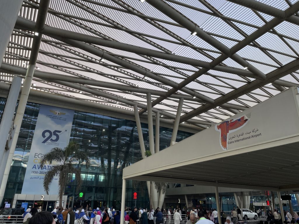 カイロ国際空港ですが、空港に着いて搭乗口に辿り着くまで、結構時間と手間がかかります。まずはターミナルの建物に入る際に、入口で手荷物の検査があります。これが大混雑を引き起こしていて、周囲はカオス状態になっています。それをクリアして何とか建物の中に入りヤレヤレと思っていると、何と再び手荷物検査が待っているのです(しかも男女別)。カウンターでのチェックインは、その検査が終わってから。しかもチェックイン後は、通常通り出国審査と手荷物検査(こちらも男女別)があるので、結局都合3回も手荷物の検査を受けなければいけません。空港に到着して出国ロビーに辿り着くまでに、1時間半ほどかかってしまいました。ちなみに途中「間に合わない…」と涙目になっている人も、チラホラ。