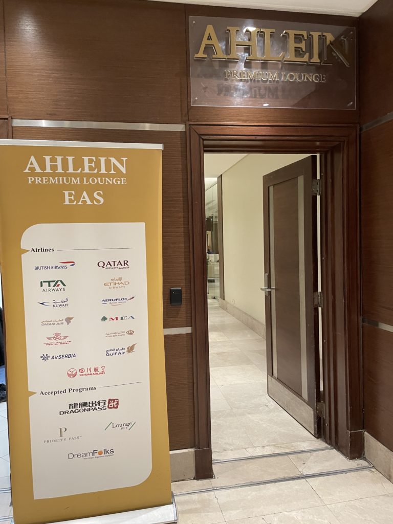 カイロでは、各種ラウンジが1か所に集められています。まずは総合受付みたいなところで搭乗券のチェックを受け、その後各ラウンジへと向かいます。指定の「Ahlein-Premium Lounge」は、その中でも一番奥にあり、そこまでの通路はまるで迷路。