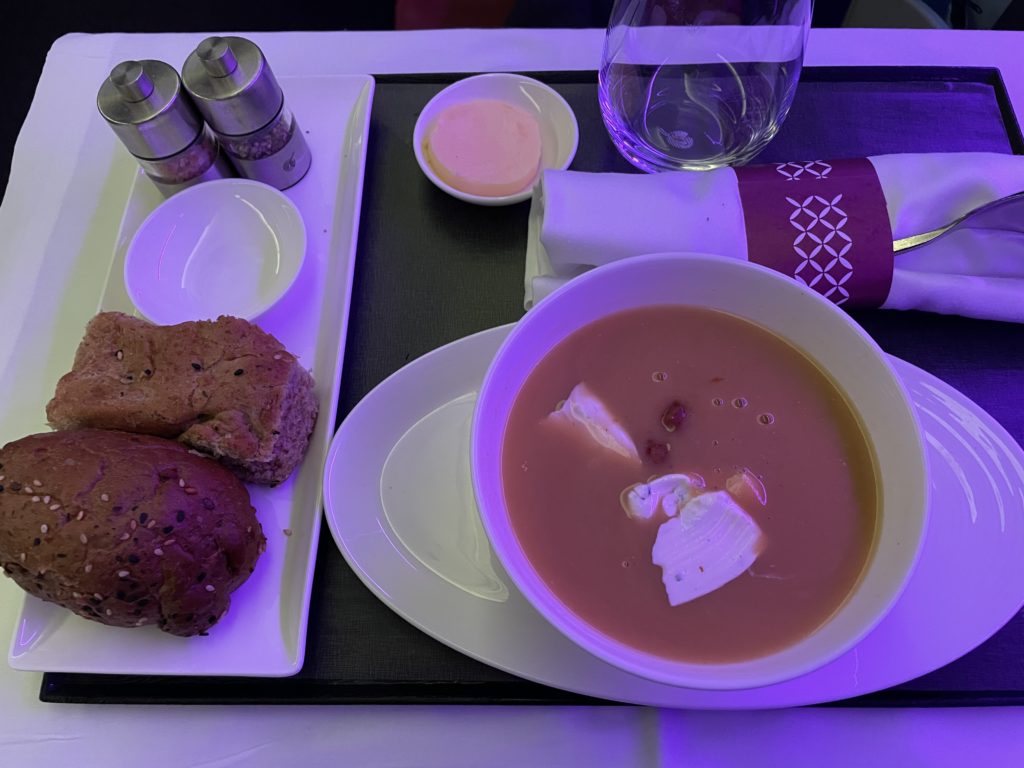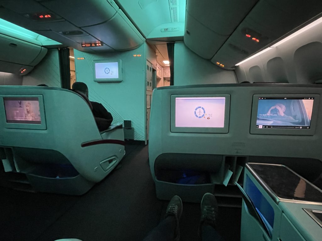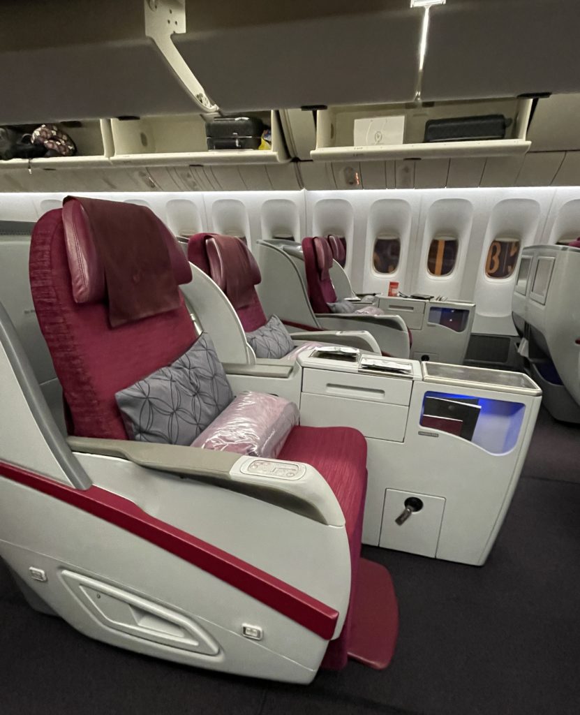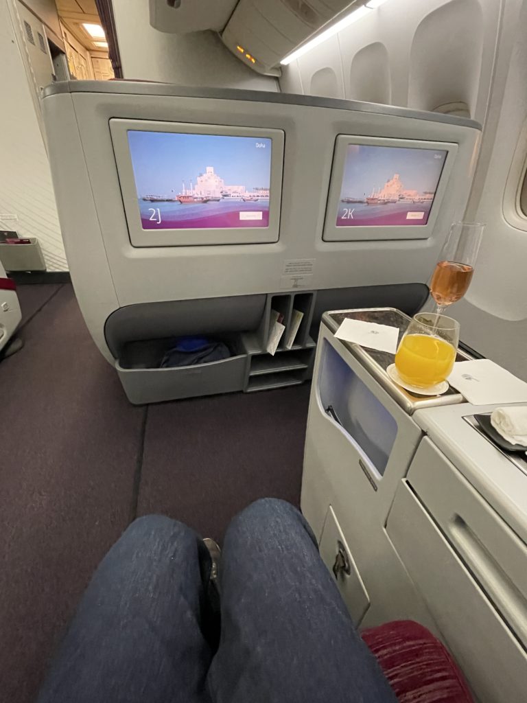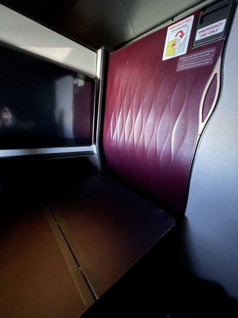 ドーハから成田へは、行きと同じB777-300ERで9時間40分。いよいよカタール航空ご自慢の、ビジネスシート「Qsuite」とご対面です。