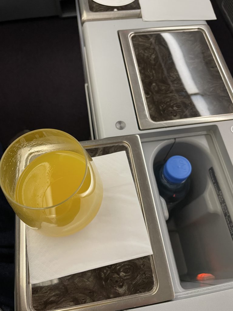 座席的には確かに昔のファーストクラスっぽいですが…。機内に入って座席を見た当初は、かなりがっかり。ただ実際に座ってみると、座り心地は良かったですし、ちゃんとフルフラットにもなりました。肘掛テーブルをずらすと、中からペットボトルがでてきたりもしました。