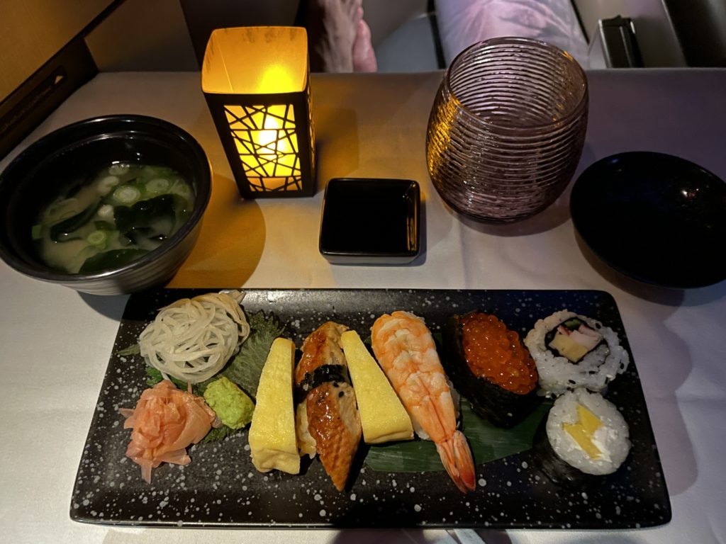さて機内食ですが、夕食はお寿司にしてみました。流石に生魚はありません。ランプがオシャレです。