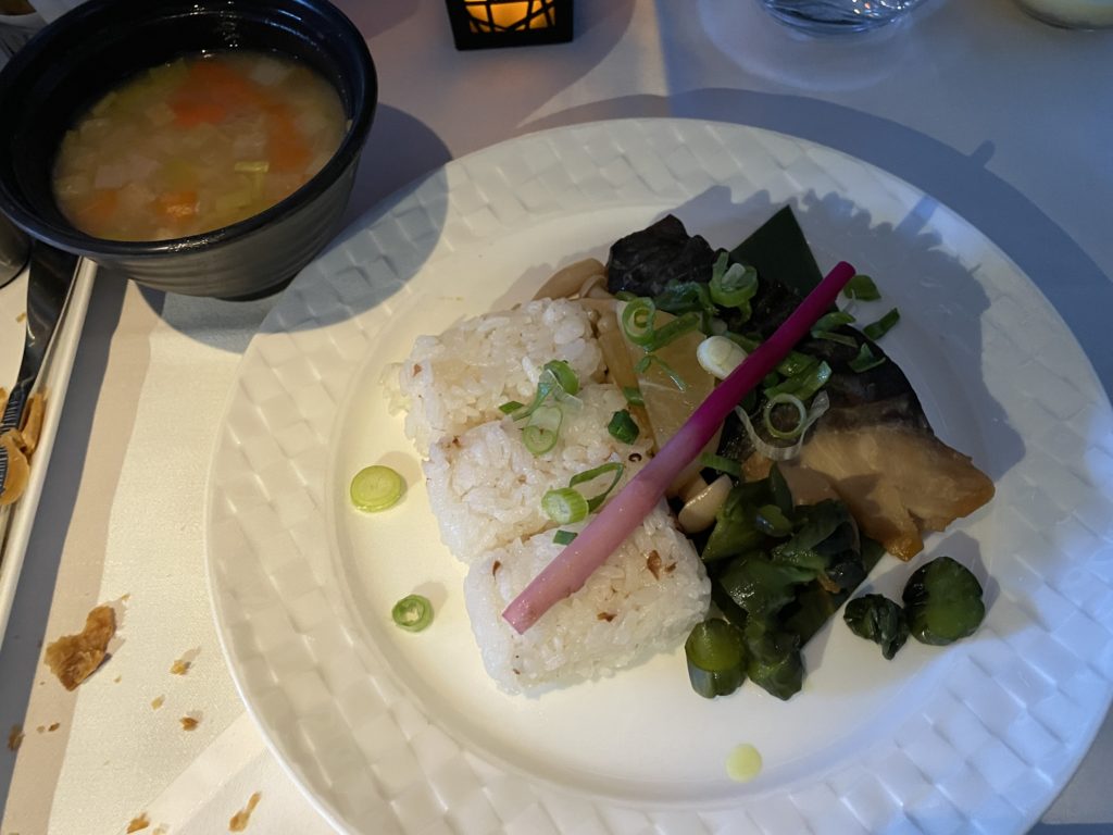 そしてメイン「ハマチの西京焼きと梅干ご飯」です。和食系のメニューは、どれもドーハで作っている割には、がんばっていたように思いました。